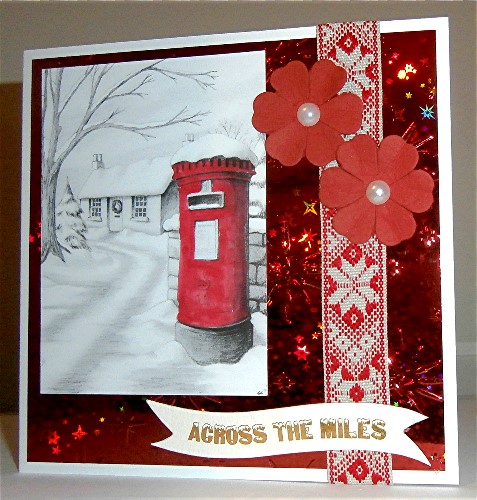 For my card I used a Delicious Doodles image called snowy postbox, colouring just the post box with a red spectrum noir pen, using a blender to make it look a bit old in places. I used a piece of holographic red mirror card with small stars all over it and ran it through an embossing folder by Embossalicious called 'let it snow'. You can see my card here on My Crafty Outlook: