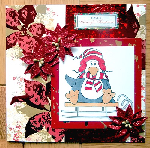 For my card I used some sparkly, shiny Papermania Christmas background paper (purchased a few years ago). The lovely Robyn's Fetish image, penguin Paul sleighing, was coloured with spectrum noir pens and mounted on to an upcycled piece of foiled card. The strip of embossed card beneath it was from my offcuts box. Glittered poinsettias were from Hobbycraft (need to get some more ... if they still sell them). You can see it here on My Crafty Outlook: